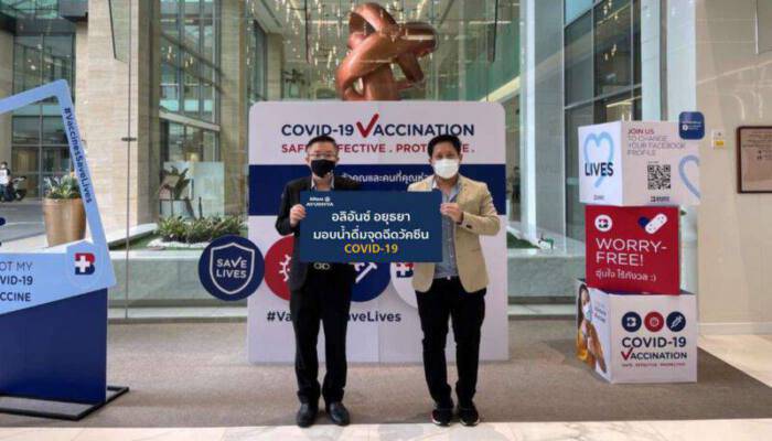 บมจ.อลิอันซ์ อยุธยา ประกันชีวิต โดย นายพิเชษฐ์ บำรุงกิจเจริญ(ขวา) ผู้อำนวยการอาวุโส ฝ่ายบริหารพื้นที่ตัวแทนภูมิภาคกรุงเทพฯ เป็นตัวแทนในการส่งมอบผลิตภัณฑ์น้ำดื่มแบบไร้ฉลาก สามารถรีไซเคิลได้ 100% จำนวน 6,408 ขวด ให้กับจุดบริการฉีดวัคซีนโควิด-19 โรงพยาบาลกรุงเทพ เพื่ออำนวยความสะดวกให้กับประชาชนที่มาใช้บริการ โดยมี นพ.มนต์สรร อัศวนพเกียรติ(ซ้าย) ผู้อำนวยการฝ่ายระบบประกันและพัฒนาผลิตภัณฑ์ โรงพยาบาลกรุงเทพ เป็นผู้รับมอบ ณ อาคารโรงพยาบาลกรุงเทพ อินเตอร์เนชั่นแนล ชั้น 3