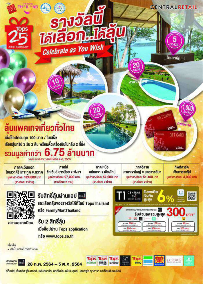 19 สิงหาคม 2564, กรุงเทพฯ : เพราะเข้าใจดีว่าทุกคนต่างคิดถึงทริปท่องเที่ยวที่ห่างหายไปนาน “ท็อปส์ และ แฟมิลี่มาร์ท” ในเครือเซ็นทรัล รีเทล ชวนทุกคนมาช้อปแล้วลุ้นรับแพคเกจท่องเที่ยวสุดหรูให้คลายความคิดถึง ช้อปแล้วลุ้นรอไว้ก่อนพร้อมเดินทางได้เมื่อไหร่เก็บกระเป๋าเตรียมบินแบบฟินๆ กับ ทริปที่พักสุดหรูทั่วไทย ในแคมเปญฉลองท็อปส์ครบรอบ 25 ปี “รางวัลนี้ได้เลือกได้ลุ้น” แพ็คเกจท่องเที่ยว 3 วัน 2 คืน พร้อมตั๋วเครื่องบินไปกลับ 2 ที่นั่ง รวมมูลค่ากว่า 6.75 ล้านบาท ให้คุณได้สัมผัสประสบการณ์สุดเอ็กซ์คลูซีฟ ดื่มด่ำบรรยากาศ พักกาย พักใจที่โรงแรมหรู