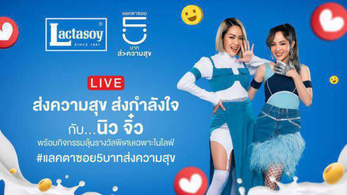 แลคตาซอย นำศิลปิน “นิวจิ๋ว” 2 ดูโอ้สาวเสียงเพราะ ควงคู่กันมา Live สด พูดคุยกับแฟนคลับในบรรยากาศสบาย ๆ เพื่อร่วมสร้างความสุข รอยยิ้ม และส่งกำลังใจ พร้อมชวนทุกคนทางบ้านมาเติมบุญด้วยการร่วมสมทบทุน หรือบริจาคเป็นผลิตภัณฑ์แลคตาซอย เพื่อนำไปมอบให้กับ รพ.สันป่าตอง จ.เชียงใหม่ แฟนคลับ “นิว-จิ๋ว” และสายบุญเฝ้ารอหน้าจอชมกิจกรรม Live สด ได้ในวันที่ 23 กันยายน 2564 เวลา 19.00 น. ทาง FB : Lactasoy https://www.facebook.com/lactasoyclub
