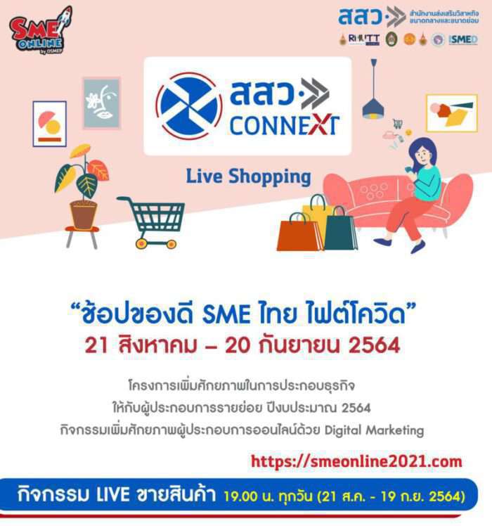 นายวีระพงศ์ มาลัย ผู้อำนวยการสำนักงานส่งเสริมวิสาหกิจขนาดกลางและขนาดย่อม (สสว.) เปิดเผยว่า ในปีนี้ โครงการเพิ่มศักยภาพในการประกอบธุรกิจให้กับผู้ประกอบการรายย่อย ปีงบประมาณ 2564 กิจกรรมเพิ่มศักยภาพผู้ประกอบการออนไลน์ด้วยดิจิทัล มาร์เก็ตติ้ง ซึ่ง สสว. มี 6 หน่วยงานพันธมิตรร่วมดำเนินการ ได้แก่ มหาวิทยาลัยธรรมศาสตร์ มหาวิทยาลัยเชียงใหม่ มหาวิทยาลัยเทคโนโลยีราชมงคลธัญบุรี มหาวิทยาลัยเทคโนโลยีราชมงคลรัตนโกสินทร์ มหาวิทยาลัยราชภัฏสวนสุนันทา และสถาบันพัฒนาวิสาหกิจขนาดกลางและขนาดย่อม ได้ปรับรูปแบบกิจกรรมให้สอดคล้องกับสถานการณ์แพร่ระบาดของโควิด-19 ที่ทำให้ต้องงดการจัดงานแสดงสินค้าและเชิญชวนให้ผู้ประกอบการมาเปิดร้านค้าออนไลน์และจัดแคมเปญส่งเสริมการขาย “ช้อปของดี SME ไทย ไฟต์โควิด” โดยได้รับความร่วมมือจากหน่วยร่วมดำเนินการทั้งภาครัฐและเอกชน มีการระดมความรู้อบรมทั้งในภาคทฤษฎีและภาคปฏิบัติให้แก่ผู้ประกอบการ รวมทั้งแพลตฟอร์มที่มีศักยภาพอย่าง JD CENTRAL LAZADA และ SHOPEE ซึ่งเปิดพื้นที่ให้ผู้ประกอบการได้มีร้านค้าออนไลน์สร้างรายได้ในช่วงวิกฤตินี้ ร่วมกันดำเนินกิจกรรมต่างๆ