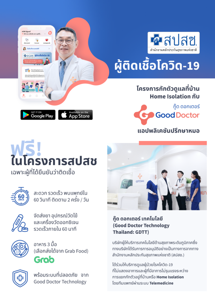 • สปสช. อนุมัติให้คลินิกแพทย์ภายใต้การบริหารของ Good Doctor Technology Thailand (GDTT) ดำเนินการรักษาผู้ป่วยโรคโควิด-19 ที่ไม่แสดงอาการ และ ผู้มีอาการไม่รุนแรง