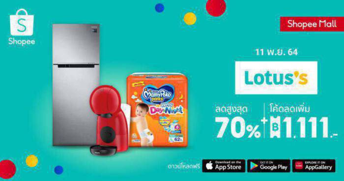 ทั้งนี้ขบวนกองทัพสินค้าไฮไลท์ในมหกรรม Shopee 11.11 Big Sale ที่ได้นำมาจัดโปรโมชั่นลดราคาสุดพิเศษเฉพาะบน Lotus’s Official Store บน Shopee Mall ประกอบด้วย ผลิตภัณฑ์กลุ่มแม่และเด็ก เช่น ผลิตภัณฑ์ BABYLOVE (เบบี้เลิฟ) กางเกงผ้าอ้อมเด็ก เดย์ไนท์แพ้นส์ ซุปเปอร์จัมโบ้ ผลิตภัณฑ์ ENSURE (เอนชัวร์) อาหารสูตรครบถ้วน กลิ่นวานิลลา 850 กรัม (3 กระป๋อง) ผลิตภัณฑ์ MERRIES (เมอร์รี่ส์) กางเกงผ้าอ้อมเด็ก ผลิตภัณฑ์ MAMYPOKO (มามี่โพโค) กางเกงผ้าอ้อมเด็ก PANTS HAPPY DAY&NIGHT ผลิตภัณฑ์กลุ่มเครื่องใช้ไฟฟ้า เช่น ตู้เย็น Samsung (ซัมซุง) 2 ประตู ขนาด 14.1 คิว รุ่น RT38K501JS8/ST ตู้เย็น Samsung (ซัมซุง) 2 ประตู 8.4 คิว รุ่น RT22FGRADSA เครื่องซักผ้าฝาบน Samsung (ซัมซุง) 15 กิโล รุ่น WA15R6380BV/ST เครื่องซักผ้าฝาบน LG (แอลจี) รุ่น T2514VS2M ระบบ Smart Inverter ความจุซัก 14 กิโลกรัม หม้อหุงข้าวดิจิทัล TEFAL (ทีฟาล์ว) 1.8 ลิตร รุ่น RK732 และหม้อทอดไร้น้ำมัน PHILIPS (ฟิลิปส์) 4.1 ลิตร รุ่น HD9200
