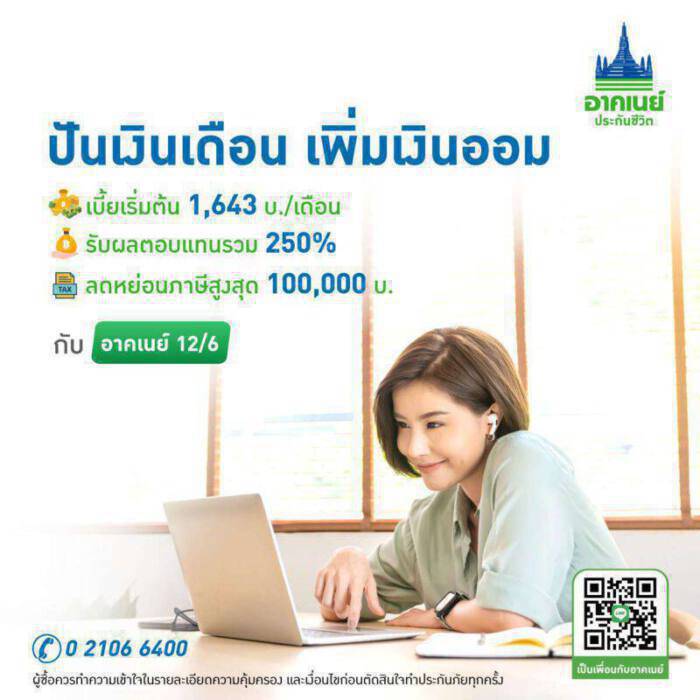 โค้งสุดท้ายกับผลิตภัณฑ์ประกันออมทรัพย์แห่งปี “อาคเนย์ 12/6” สำหรับมนุษย์เงินเดือนชาวออฟฟิศ อายุ 20-60 ปี ที่ต้องการแบ่งเงินเดือนไว้เพื่อเป็นเงินออมในอนาคต โดยให้ความคุ้มครองถึง 12 ปี ออมสบายๆ จ่ายเบี้ยเบาๆ ระยะสั้นเพียง 6 ปี เท่านั้น จำนวนเงินเอาประกันภัยสูงสุด 300,000 บาท รับเงินจ่ายคืน 2% ของจำนวนเงินเอาประกันภัยทุกสิ้นปีกรมธรรม์ ตั้งแต่ปีที่ 1 ถึง ปีที่ 11 พร้อมรับผลประโยชน์รวมตลอดสัญญา และความคุ้มครองชีวิตสูงถึง 250% ของจำนวนเงินเอาประกันภัยนอกจากนี้ยังสามารถลดหย่อนภาษีได้สูงสุด 100,000 บาท (ตามหลักเกณฑ์และเงื่อนไขของกรมสรรพากร)