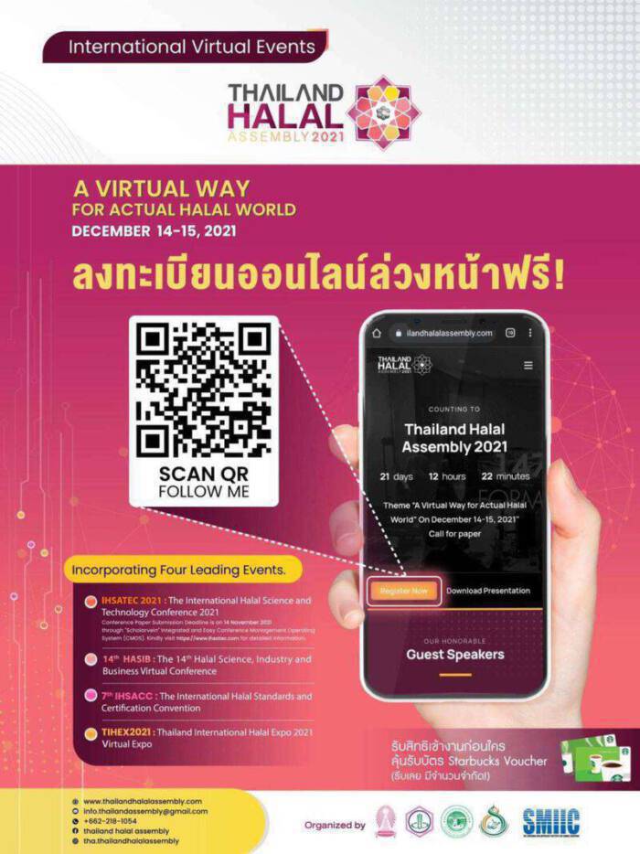 02-218-1054 – 224#THA2021 #Thailanadhalalaseembly2021Pre-register for THA 2021, win a 100 THB Starbucks voucher (limited)THAILAND HALAL ASSEMBLY 2021 International Virtual Event“A Virtual Way for Actual Halal World”▶️ https://virtualthailandhalalassembly.com/pre-register/December 14-15, 2021In Coupling With– IHSATEC 2021 : The International Halal Science and Technology Conference 2021– 14th HASIB : The 14th Halal Science, Industry and Business Virtual Conference– 7th IHSACC : The International Halal Standards and Certification– TIHEX2021 : Thailand International Halal Expo 2021 Virtual Expowebsite :https://thailandhalalassembly.com/info.thailandhalalassembly@gmail.com📍 For more information or updated news, please contact 02-218-1053 ext. 224 and www.Thailandhalalassembly.com , Facebook : Thailand Halal Assembly02-218-1054 – 224#THA2021 #Thailanadhalalaseembly2021