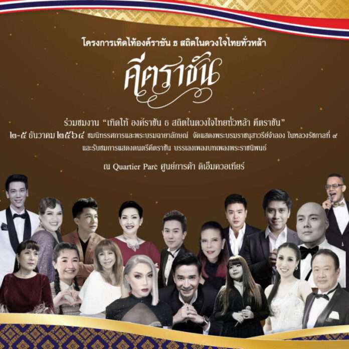 เนื่องในโอกาส “วันพ่อแห่งชาติ” วันคล้ายวันเฉลิมพระชนมพรรษาของพระบาทสมเด็จพระปรมินทรมหาภูมิพลอดุลยเดช บรมนาถบพิตร โครงการเทิดไท้ องค์ราชัน ธ สถิตในดวงใจไทยทั่วหล้า ร่วมกับ เดอะมอลล์ กรุ๊ป จำกัด และ บริษัทในเครือฯ, บมจ.ธนาคารกรุงเทพ, บริษัท บิทคับ แคปปิตอล กรุ๊ป โฮลดิ้งส์ จำกัด, บมจ. แอดวานซ์ อินโฟร์ เซอร์วิส และ บมจ. ไทยเบฟเวอเรจ ขอเชิญประชาชนคนไทยทุกคนร่วมงาน “เทิดไท้องค์ราชัน ธ สถิตในดวงใจไทยทั่วหล้า คีตราชัน” งานแสดงพระบรมรูปรัชกาลที่ ๙ เท่าองค์จริงที่จัดสร้างขึ้นเพื่อนำขึ้นทูลเกล้าถวายในหลวงรัชกาลที่ ๑๐ ได้สร้างเสร็จสมบูรณ์แล้วพร้อมเปิดให้ประชาชนชาวไทยได้ร่วมกราบสักการะ พร้อมกันนั้นในงานยังมีนิทรรศการจัดแสดง “พระรูปปั้น” และ “พระบรมฉายาลักษณ์ของในหลวงรัชกาลที่ ๙ ที่มีพระปรมาภิไธยกำกับ” ที่หาชมได้ยากยิ่งนำมาจัดแสดงด้วย และพลาดไม่ได้กับการแสดงดนตรีคีตราชัน บรรเลงเพลงบทเพลงพระราชนิพนธ์ โดย “วงเฉลิมราชย์” ขับร้องโดยศิลปินชั้นนำของไทยที่จะสลับหมุนเวียนกันในแต่ละวัน อาทิ ม.ล.ขวัญทิพย์ เทวกุล, รัดเกล้า อามระดิษ, นนทิยา จิวบางป่า, รวิวรรณ จินดา, เมทนี บุรณศิริ, กิต The Voice-กิตตินันท์ ชินสำราญ, อาร์ม กรกันต์, วิภู กำเนิดดี, ศรัณย์ คุ้งบรรพต , บุญเกียรติ โชควัฒนา, บุปผา กิ่งชัชวาล เป็นต้น ที่จะมาร่วมขับกล่อม “บทเพลงพระราชนิพนธ์” และ “บทเพลงรัก” ตั้งแต่เวลา ๑๘.๐๐ – ๒๐.๓๐ น. เพื่อน้อมรำลึกในพระมหากรุณาธิคุณของในหลวง รัชกาลที่ ๙ ที่สถิตในดวงใจไทยทั่วหล้าไม่มีวันลืมเลือน พบกัน ๒ – ๕ ธันวาคม 2564 ณ ควอเทียร์ พาร์ค ชั้น M ศูนย์การค้า ดิ เอ็มควอเทียร์