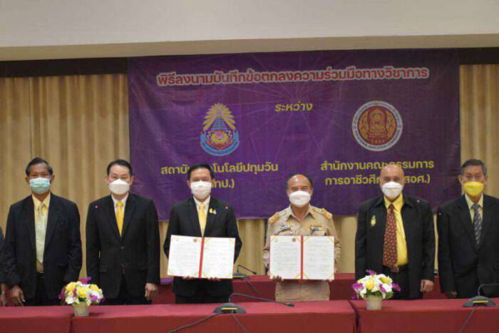 รองศาสตราจารย์ ดร.เสถียร ธัญญศรีรัตน์ รักษาราชการแทนอธิการบดีสถาบันเทคโนโลยีปทุมวัน พร้อมด้วยนายสืบพงษ์ ม่วงชู รองอธิการบดี และว่าที่ร้อยตรี ดร.มงคล กลิ่นกระจาย รองอธิการบดี ร่วมลงนามความร่วมมือทางวิชาการพัฒนาศักยภาพบุคลากรและนวัตกรรม กับสำนักงานคณะกรรมการการอาชีวศึกษา(สอศ.) โดยมีผู้ร่วมลงนาม นายบุญชู สมบุญเพ็ญ คณบดีคณะวิทยาศาสตร์และเทคโนโลยี, นายณรงค์ชัย เจริญรุจิทรัพย์ ผู้อำนวยการสำนักความร่วมมือ สอศ. และนายมณฑล ภาคสุวรรณ์ รองเลขาธิการคณะกรรมการการศึกษา สำนักงานคณะกรรมการการอาชีวศึกษา (สอศ.) ณ ห้องประชุมสวัสดิวัดนวิศิษฎ์ ชั้น 7 อาคารเฉลิมพระเกียรติ สถาบันเทคโนโลยีปทุมวัน
