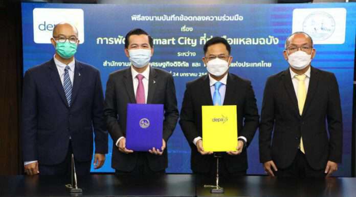 ผศ.ดร.ณัฐพล นิมมานพัชรินทร์ ผู้อำนวยการใหญ่ สำนักงานส่งเสริมเศรษฐกิจดิจิทัล หรือ ดีป้า พร้อมด้วย เรือโท ยุทธนา โมกขาว รองผู้อำนวยการการท่าเรือแห่งประเทศไทย สายบริหารการเงินและกลยุทธ์องค์กร รักษาการแทนผู้อำนวยการการท่าเรือแห่งประเทศไทย ร่วมลงนามในบันทึกข้อตกลงความร่วมมือการพัฒนา Smart City ที่ท่าเรือแหลมฉบัง เพื่อมุ่งสู่การเป็นเมืองอัจฉริยะ ณ อาคารดีป้า ลาดพร้าว