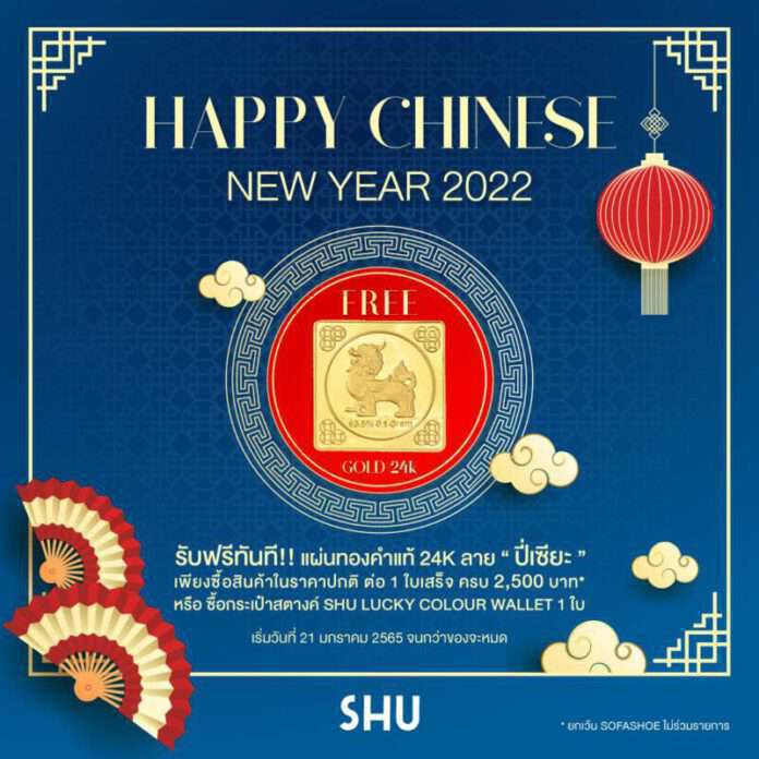SHU ต้อนรับเทศกาลตรุษจีนปีเสือทอง มอบของขวัญล้ำค่าสุดเฮงแบบทวีคูณ เพียงซื้อสินค้าราคาปกติครบ 2,500 บาท หรือ ซื้อกระเป๋าสตางค์ SHU LUCKY COLOUR WALLET 1 ใบ ราคา 3,590 บาท รับฟรีทันที!! แผ่นทองคำแท้ 24K ลาย “ปี่เซียะ” วัตถุมงคลสุดปังเสริมโชคลาภ ร่ำรวยถ้วนหน้า คู่กับกระเป๋าสตางค์มงคลที่ออกมาแบบตามหลักฮวงจุ้ย ที่รับรองว่าใช้แล้วเรียกโชคลาภ