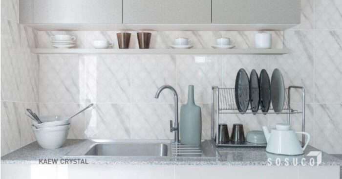 พื้นที่ในห้องครัว ฮวงจุ้ยที่ดีสำหรับบ้านเพิ่มความหรูหราด้วยกระเบื้องลายแก้วคริสตัล ขาว เพราะ การเก็บของจัดวางให้เป็นระเบียบ โดยเฉพาะห้องครัวที่เปรียบเหมือนท้องพระคลัง ห้องแห่งขุมทรัพย์ มีอุปกรณ์สำหรับจัดเตรียมอาหาร ทั้งชิ้นใหญ่ชิ้นเล็กมากมาย จึงควรจัดเก็บอุปกรณ์ครัวต่าง ๆ ไว้ในตู้ หรือชั้นวางของ แม้แต่เศษอาหาร หรือขยะก็ควรเก็บใส่ถุงทิ้งทุกวัน ไม่ให้เป็นอาหารของมด แมลงสาบ และหนู เนื่องจากห้องครัวมีความชื้นจากน้ำและมีคราบน้ำมันจากการทำอาหาร เพื่อให้สามารถเช็ดทำความสะอาดได้ง่ายและป้องกันการเกิดเชื้อราบนผนังที่มาจากความชื้นของน้ำ การใช้กระเบื้องกรุผนังจึงเป็นการตอบโจทย์ กระเบื้องลายแก้วคริสตัล ขาว เป็นการออกแบบลวดลายจากโมเสกชิ้นรูปทรงสี่เหลี่ยมข้าวหลามตัด มาวางเรียงต่อกัน ทำร่องลึกเหมือนการใช้กระเบื้องโมเสกจริง เคลือบผิวมันวาว ทำให้ผนังเกิดมิติ เพิ่มความหรูด้วยลายเส้นริ้วเทาของหินอ่อนเหมือนลายเมฆ ทำให้ห้องครัวสวยเรียบหรูอย่างมีสไตล์ ตามความเชื่อตามศาสตร์ฮวงจุ้ยกล่าวไว้ว่ากระเบื้องลายเมฆ จะช่วยให้ผู้อยู่อาศัยมั่งคั่ง ร่ำรวยทั้งสินทรัพย์และมิตรภาพ