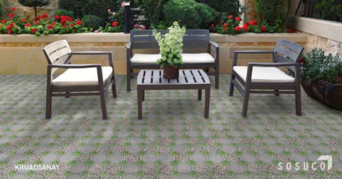 เปิดพื้นที่ระเบียงบ้านหรือลานนอกบ้านในสวน ให้ใกล้ชิดกับธรรมชาติ ไปกับกระเบื้องลายกรวดเสน่ห์ เพียงแค่ชื่อลาย ก็อาจทำให้หลายคนคิดถึงอารมณ์ย้อนสมัยสุดคลาสิก ที่ดีไซน์เนอร์ผสมผสานแรงบันดาลใจของ ลานนอกบ้านในสวน ด้วย หญ้าและหิน ที่เพิ่มเสน่ห์ให้ลายหินเล็กๆ ด้วยหินกรวด ที่เกิดจากตะกอนของหิน กรวด ทราย ที่ถูกกระแสน้ำพัดพามาทับถมทำให้เกิดความสวยจากเฉดสีที่ต่างกันในเม็ดหิน แล้วนำมาจัดวางในรูปของแบบของโมเสก 8 เหลี่ยมหรือบล็อคปูพื้นลายรังผึ้ง เพิ่มความเป็นธรรมชาติด้วยการแซมต้นหญ้าเป็นหย่อมเล็ก ๆ ในแผ่นกระเบื้อง ทำให้ลานบ้านสวยเหมือนสวนหินธรรมชาติได้อย่างลงตัว พร้อมให้อารมณ์คลาสิกสไตล์วินเทจที่ไม่รู้เบื่อ เหมาะสำหรับใช้เป็นพื้นที่สังสรรค์สำหรับคนในครอบครัว หรือเปิดให้นั่งชิลล์พักผ่อนในเวลาที่เป็นส่วนตัวเพราะ ตามศาตร์ฮวงจุ้ย กระเบื้องลายธรรมชาติที่มีลวดลายของหิน ต้นไม้ ใบหญ้า จะนำความร่มเย็นเป็นสุข เพิ่มความมีชีวิตชีวา สดใส ให้กับคนในครอบครัวด้วยจ้า