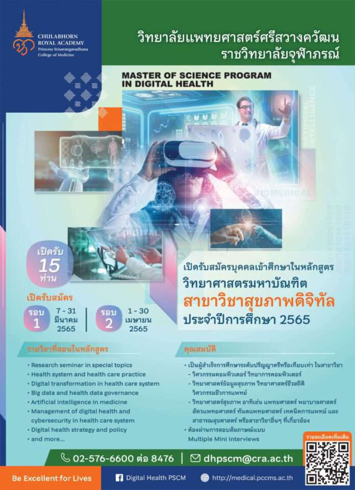 วิทยาลัยแพทยศาสตร์ศรีสวางควัฒน ราชวิทยาลัยจุฬาภรณ์ ประกาศเปิดรับสมัครผู้สนใจ เข้าร่วมศึกษาหลักสูตรวิทยาศาสตรมหาบัณฑิต สาขาวิชาสุขภาพดิจิทัล (Master of Science Program in Digital Health) หลักสูตรใหม่ พ.ศ. ๒๕๖๕ เป็นหลักสูตรระดับปริญญาโท ๒ ปี จำนวนหน่วยกิตรวมตลอดหลักสูตร ไม่น้อยกว่า ๓๖ หน่วยกิต โดยรับสมัครทั้งนักศึกษาไทยและนักศึกษาต่างชาติที่สามารถใช้ภาษาไทยได้เป็นอย่างดี สามารถสื่อสารภาษาไทยและภาษาอังกฤษได้ทั้งการพูด อ่าน เขียน บัณฑิตที่สำเร็จการศึกษาจากหลักสูตรฯ นี้ จะมีทักษะที่สำคัญสำหรับการใช้ชีวิตและทำงานในศตวรรษที่ ๒๑ อาทิ (๑) ทักษะการเรียนรู้และนวัตกรรม (๒) ทักษะสารสนเทศ สื่อ และเทคโนโลยี และ (๓) ทักษะชีวิตและอาชีพ ที่สามารถพัฒนางานวิจัยนวัตกรรมเพื่อเพิ่มศักยภาพทางการแพทย์ อีกทั้งยังต้องตระหนักถึงความรับผิดชอบต่อสังคมและพัฒนาชุมชนอย่างยั่งยืน