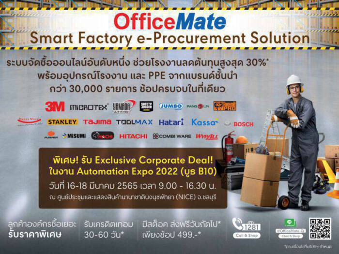 ออฟฟิศเมท ชูโซลูชั่นจัดซื้อออนไลน์อันดับหนึ่ง ชวนโรงงานและคลังสินค้าลดต้นทุน เพิ่มประสิทธิภาพให้ธุรกิจ พบกันได้ที่งาน AUTOMATION EXPO 2022 สวนนงนุช พัทยา