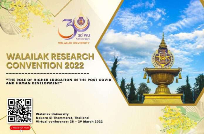 รองศาสตราจารย์ ดร.ทนงศักดิ์ อิ่มใจ  รักษาการแทนผู้อำนวยการสถาบันวิจัยและนวัตกรรม ม.วลัยลักษณ์ (มวล.) เปิดเผยว่า มหาวิทยาลัยวลัยลักษณ์ โดยสถาบันวิจัยและนวัตกรรม เตรียมจัดการประชุมวิชาการระดับนานา ชาติมหาวิทยาลัยวลัยลักษณ์ “Walailak Research Convention 2022” ครั้งที่ 1 เนื่องในโอกาสครบปีที่ 30 แห่งการสถาปนามหาวิทยาลัยวลัยลักษณ์ ภายใต้แนวคิด : “The Role of Higher Education in the Post Covid and Human Development” เพื่อเป็นเวทีในการนำเสนอผลงานวิชาการและแลกเปลี่ยนความรู้ ประสบ การณ์ระหว่างนักวิจัยทั้งในประเทศและต่างประเทศ  พัฒนาต่อยอดงานวิจัย และกระตุ้นให้เกิดการพัฒนางานวิจัยที่เข้มแข็ง มั่นคง มั่งคั่งและยั่งยืน ตอบสนองความต้องการของสังคมอย่างแท้จริง มีกำหนดจัดขึ้นระหว่างวันที่ 28 – 29 มีนาคม 2565 นี้ ณ มหาวิทยาลัยวลัยลักษณ์