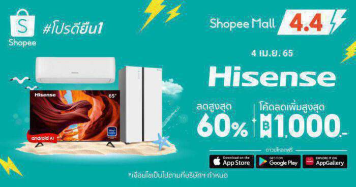 ขึ้นชื่อว่าฤดูร้อนของประเทศไทย หลายๆ คนคงจินตนาการถึงความรู้สึกกันได้ดีว่าร้อนเหงื่อตกขนาดไหน ทั้งอุณหภูมิ แสงแดด และความหนาแน่นของผู้คนที่เบียดเสียดกันในสถานที่ต่างๆ ยิ่งเพิ่มดีกรีร้อนอย่างทวีคูณให้กับผู้คนทั้งร่างกายและจิตใจ ทำให้ในช่วงนี้คนไทยจึงอยากใช้ชีวิตเย็นสบายและผ่อนคลายกันอยู่ที่บ้านมากขึ้น ไฮเซ่นส์ (Hisense) ผู้นำด้านเทคโนโลยีสมาร์ททีวี และเครื่องใช้ไฟฟ้าภายในบ้านระดับโลกมีความเข้าใจถึง Pain Point ของคนไทยในฤดูร้อนเป็นอย่างดี จึงผนึกกำลังกับช้อปปี้ (Shopee) ร่วมคลายร้อนให้คนไทยได้อยู่บ้านอย่างเย็นฉ่ำสบายใจ แถมสบายกระเป๋า ด้วยการยกทัพเครื่องใช้ไฟฟ้าภายในบ้านหลากหลายประเภท มามอบโปรดียืน 1 กับส่วนลดแรงเว่อร์ซัมเมอร์เซลสูงสุด 60% พร้อมลุ้นรับโค้ดส่วนลดเพิ่มเติมสูงสุดถึง 3,000 บาท ในแคมเปญลดราคาสุดยิ่งใหญ่ Shopee 4.4 Shocking Sale ตั้งแต่วันที่ 28 มีนาคม – 4 เมษายน 2565 หรือคุ้มค่าอีกต่อเมื่อชำระเงินด้วย ShopeePay ทั้งยังสามารถสนุกกับการเลือกช้อปท๊อปสินค้าโปรแรงที่คัดสรรมาให้แล้วเป็นอย่างดี อาทิ