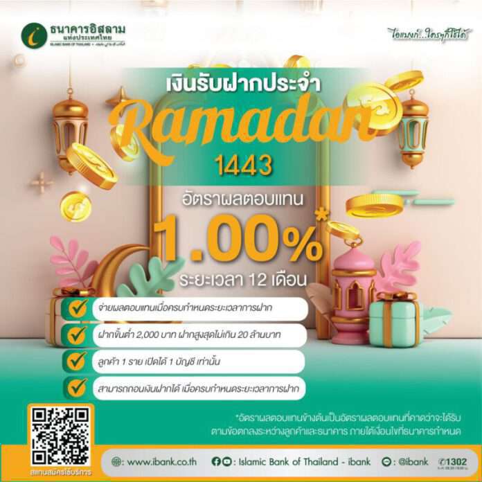 ธนาคารอิสลามแห่งประเทศไทย (ไอแบงก์) มอบความสุขให้คนรักการออมในเดือนรอมฎอนอันประเสริฐปีนี้ ด้วยผลิตภัณฑ์เงินรับฝากประจำ “Ramadan 1443” ที่มีอัตราผลตอบแทนที่คาดว่าจะได้รับสูงถึง 1.00% ต่อปี เปิดบัญชีเริ่มต้นที่ 2,000 บาทต่อบัญชี ฝากนาน 12 เดือน