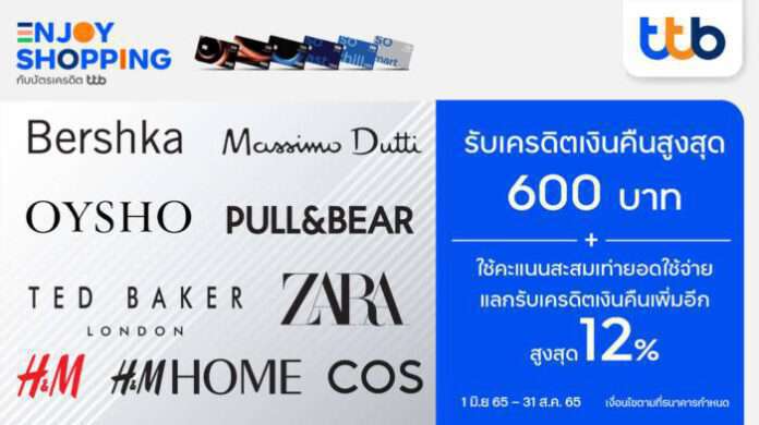 บัตรเครดิต ทีทีบี ชวนแฟชั่นเลิฟเวอร์อัปเทรนด์ให้สุดปัง พร้อมรับสิทธิพิเศษสุดคุ้มสบายกระเป๋า เมื่อช้อปผลิตภัณฑ์แบรนด์ BERSHKA, MASSIMO DUTTI, OYSHO, PULL&BEAR, TED BAKER, ZARA, H&M, H&M Home และ COS รวมรายการช้อปแบบออนไลน์ ตั้งแต่วันที่ 1 มิถุนายน – 31 สิงหาคม 2565 เมื่อชำระค่าสินค้าเต็มจำนวนด้วยบัตรเครดิต ทีทีบี รับสิทธิพิเศษ ดังนี้