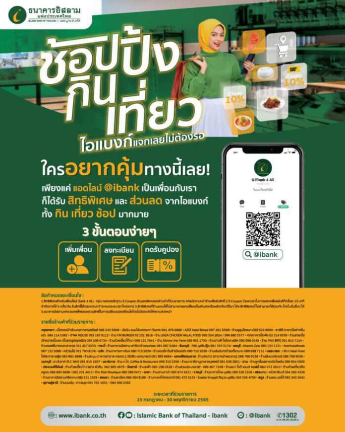 ธนาคารอิสลามแห่งประเทศไทย (ไอแบงก์) จับมือ edtguide.com เปิดตัวแคมเปญ “ช้อปปิ้ง กิน เที่ยว ไอแบงก์แจกเลยไม่ต้องรอ” มอบส่วนลดสุดพิเศษจากร้านค้าฮาลาล กว่า 40 ร้าน ระยะเวลาตั้งแต่วันที่ 15 กรกฎาคม – 30 พฤศจิกายน 2565