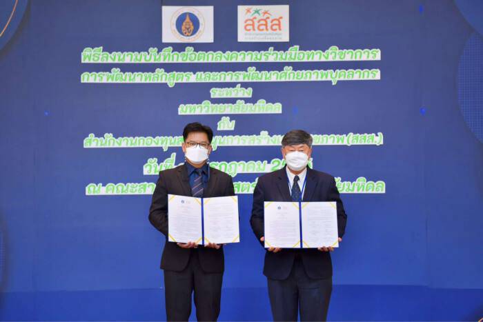 เมื่อวันที่ 22 กรกฎาคม 2565 ณ คณะสาธารณสุขศาสตร์ มหาวิทยาลัยมหิดล ศ.นพ.บรรจง มไหสวริยะ อธิการบดีมหาวิทยาลัยมหิดล ร่วมลงนามบันทึกข้อตกลงความร่วมมือทางวิชาการกับ ดร.ประกาศิต กายะสิทธิ์ รองผู้จัดการกองทุนสนับสนุนการสร้างเสริมสุขภาพ (สสส.) เรื่องการพัฒนาหลักสูตร และการพัฒนาศักยภาพบุคลากร