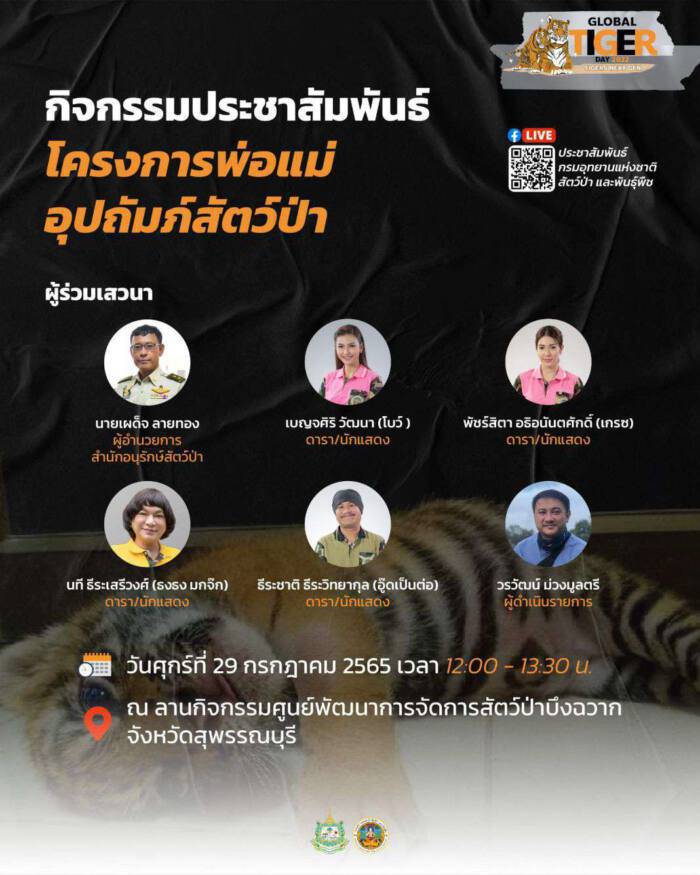 นายรัชฎา สุริยกุล ณ อยุธยา อธิบดีกรมอุทยานแห่งชาติ สัตว์ป่า และพันธุ์พืช เปิดเผยว่า ในวันที่ 29 กรกฎาคม ของทุกปี เป็นวันเสือโคร่งโลก (GLOBAL TIGER DAY) โดยกรมอุทยานแห่งชาติ สัตว์ป่า และพันธุ์พืช ได้ให้ความสำคัญกับงานด้านการอนุรักษ์เสือโคร่งมาอย่างต่อเนื่อง ซึ่งในปี 2565 ได้ร่วมกับองค์กรภาครัฐ และภาคเอกชน ที่เกี่ยวข้องด้านการอนุรักษ์เสือโคร่ง จำนวน 10 หน่วยงาน ประกอบด้วย องค์การสวนสัตว์แห่งประเทศไทย ในพระบรมราชูปถัมภ์ คณะวนศาสตร์ มหาวิทยาลัยเกษตรศาสตร์ โครงการพัฒนาแห่งสหประชาชาติ (UNDP) องค์การระหว่างประเทศเพื่อการอนุรักษ์ธรรมชาติ (IUCN) สมาคมอนุรักษ์สัตว์ป่า (WCS) ประเทศไทย องค์การกองทุนสัตว์ป่าโลกสากล สำนักงานประเทศไทย (WWF – THAILAND) สมาคมสัตววิทยาแห่งลอนดอน (ZSL) ประเทศไทย องค์การแพนเทอรา (Panthera) ประเทศไทย มูลนิธิสืบนาคะเสถียร และองค์กร TRAFFIC