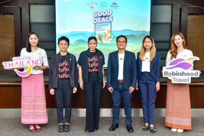 “การท่องเที่ยวแห่งประเทศไทย (ททท.)” จับมือ “Robinhood” (โรบินฮู้ด) แอปเพื่อคนตัวเล็ก รวมพลังเดินหน้ากระตุ้นการท่องเที่ยวภายในประเทศ หวังกระตุ้นการเดินทางท่องเที่ยวและอัตราการเข้าพักช่วงปลายปี 2565 สร้างเงินหมุนเวียนในพื้นที่กว่า 40 ล้านบาท ผ่านแคมเปญ “Good Deals” ชวนคนไทยแอ่วเชียงใหม่ สัมผัสประสบ การณ์ “เรื่องกิน เรื่องเที่ยว เรื่องเดียวกัน” แบบคุ้มค่า นำร่องที่เชียงใหม่เป็นที่แรก ก่อนต่อยอดขยายสู่จังหวัดอื่นๆ ต่อไป โดยมี นางสาวสรัสวดี อาสาสรรพกิจ (ซ้าย) ผู้อำนวยการภูมิภาคภาคเหนือ การท่องเที่ยวแห่งประเทศไทย นางสาวฐาปนีย์ เกียรติไพบูลย์ (ที่ 2 จากซ้าย) รองผู้ว่าการด้านตลาดในประเทศ การท่องเที่ยวแห่งประเทศไทย นายสีหนาท ล่ำซำ (ที่ 2 จากขวา) ประธานเจ้าหน้าที่บริหาร บริษัท เพอร์เพิล เวนเจอร์ส จำกัด และนางสาวลลิตพัทร ชัยมงคล (ขวา) Head of Travel Business บริษัท เพอร์เพิล เวนเจอร์ส จำกัด ให้เกียรติร่วมเปิดแคมเปญ ณ การท่องเที่ยวแห่งประเทศไทย สำนักงานใหญ่ เมื่อเร็วๆ นี้