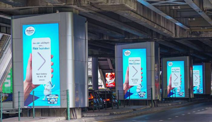 สร้างความฮือฮาทั่วโลกโซเชียล ด้วยโฆษณาที่ภาพสมาร์ทโฟนหายไปจากโฆษณาทั้งหมด พร้อมข้อความ “ขอไม่ใส่รูป เพราะ Flex ใหม่กำลังมา” “รอรุ่นใหม่ที่ดีกว่า” ชวนให้คนสงสัยว่าเหล่าสมาร์ทโฟนหายไปไหน แล้วอะไรกำลังจะมา อีกทั้งยังให้ทุกคนได้มาร่วมลุ้นถึง The Next Galaxy รุ่นใหม่ พร้อมตอกย้ำกระแสการรอคอย The Next Galaxy ด้วยการส่งภาพโฆษณาขึ้นสื่อเอาท์ดอร์ย่านสุขุมวิท ณ สถานีรถไฟฟ้า BTS พร้อมพงษ์ โดยมีแบรนด์ยักษ์ใหญ่ที่เข้าร่วมกว่า 20 แบรนด์ ได้แก่ IT CITY, Jaymart, BaNANA, Power Mall, TG FONE, JD Central, Lazada, Shopee, KFC, Power Buy, We TV Thailand, Joox, EV Me, The Pizza Company, On The Table Tokyo Café, ZEN Japanese Restaurant, Meiji Bulgaria Yogurt, Oishi Drink Station, Bear House, Property Perfect, Chester Grill และ Central