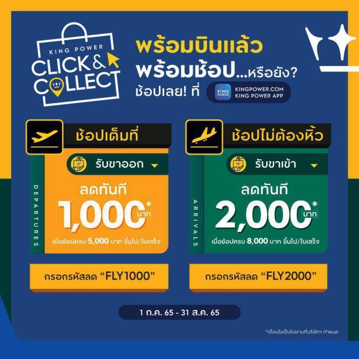 เพื่อให้การกลับมาเดินทางอีกครั้งมีความหมายมากขึ้น คิง เพาเวอร์ พร้อมมอบโปรโมชั่นสุดคุ้มให้นักเดินทางเมื่อมีไฟลต์บิน ผ่านบริการ KING POWER CLICK & COLLECT ในช่องทาง www.kingpower.com และ KING POWER แอปพลิเคชัน ด้วยความคุ้ม 2 ต่อ