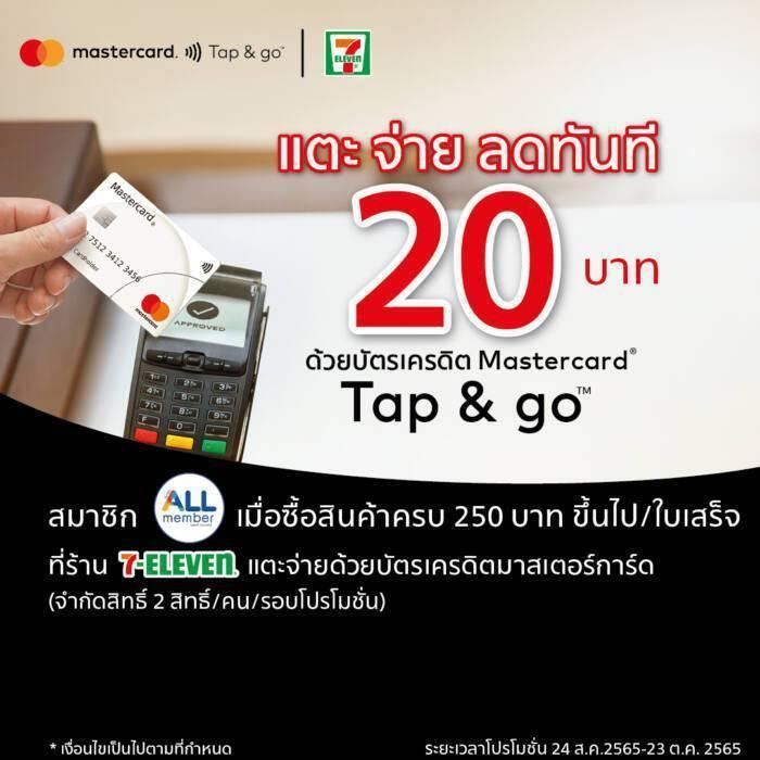 - เลือกใช้จ่ายแบบไร้สัมผัสผ่านบัตรเครดิตมาสเตอร์การ์ด รับส่วนลดทันที 20 บาท เมื่อซึ้อสินค้ากว่า 250 บาท ที่เซเว่น อีเลฟเว่น ตั้งแต่ 24 สิงหาคม จนถึง 23 ตุลาคม 2565 (จำกัดจำนวน 2 สิทธิ์/ผู้ถือบัตร/ช่วงโปรโมชั่น)