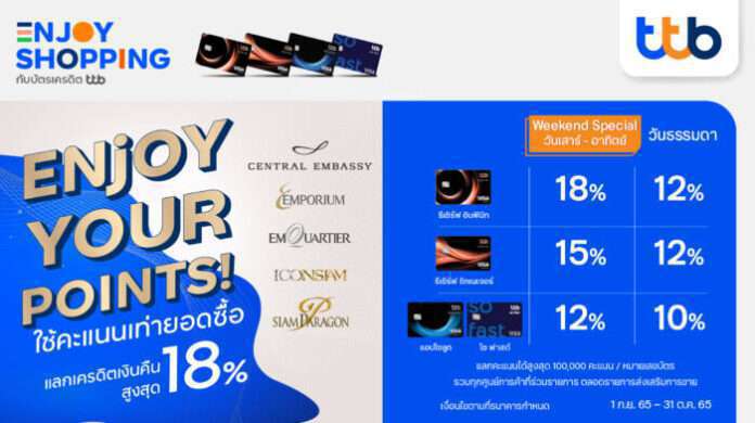 บัตรเครดิต ทีทีบี จัดแคมเปญ “Points Mania” มอบสิทธิพิเศษสำหรับผู้ถือบัตรเครดิต ทีทีบี บัตรเครดิต ทีเอ็มบี และบัตรเครดิต ธนชาต รับเครดิตเงินคืนสูงสุด 18% เมื่อใช้คะแนนสะสมแลกเท่ายอดใช้จ่าย สำหรับบัตรเครดิตประเภทที่มีคะแนนสะสม เมื่อจับจ่ายสินค้าที่ 5 ศูนย์การค้าดัง ได้แก่ Central Embassy, The Emporium & The EmQuartier, ICONSIAM และ Siam Paragon ยกเว้นรายการใช้จ่ายในแผนกซูเปอร์มาร์เก็ต ห้างสรรพสินค้า และรายการผ่อนชำระ ระหว่างวันที่ 1 กันยายน 2565–31 ตุลาคม 2565