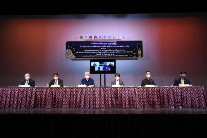 วันที่ 14 กันยายน 2565 เวลา 14.00 น. กรมส่งเสริมวัฒนธรรม (สวธ.) กระทรวงวัฒนธรรม ร่วมมือกับ สมาคมดนตรีและมาร์ชชิ่งอาร์ทสากล และสมาชิกภาคีเครือข่ายโครงการพัฒนาดนตรีศึกษา ดนตรีมาร์ชชิ่งอาร์ท และวงโยธวาทิต อีก 8 มหาวิทยาลัย ได้แก่ คณะมนุษยศาสตร์ มหาวิทยาลัยนเรศวร คณะศิลปกรรมศาสตร์ มหาวิทยาลัยทักษิณ คณะศิลปกรรมศาสตร์ มหาวิทยาลัยราชภัฏสงขลา คณะกรรมการส่งเสริมกิจการมหาวิทยาลัยขอนแก่น คณะมนุษยศาสตร์ มหาวิทยาลัยราชภัฏเชียงราย คณะศึกษาศาสตร์และศิลปะศาสตร์ มหาวิทยาลัยหาดใหญ่ บันทึกลงนามในข้อตกลงความร่วมมือ (MOU) ในการพัฒนาดนตรีศึกษา ดนตรีมาร์ชชิ่งอาร์ท และวงโยธวาทิต โดยมีนายชาย นครชัย อธิบดีกรมส่งเสริมวัฒนธรรม ให้เกียรติเป็นประธาน พร้อมด้วย นายสมเมธ ยุวะสุต นายกสมาคมดนตรีและมาร์ชชิ่งอาร์ทสากล คณบดีจากมหาวิทยาลัยนเรศวร มหาวิทยาลัยราชภัฏเชียงราย มหาวิทยาลัยพายัพ มหาวิทยาลัยทักษิณ มหาวิทยาลัยหาดใหญ่ มหาวิทยาลัยพะเยา มหาวิทยาลัยเกษตรศาสตร์ มหาวิทยาลัยราชภัฏสงขลา มหาวิทยาลัยมหาสารคาม มหาวิทยาลัยเชียงใหม่ มหาวิทยาลัยขอนแก่น คณะผู้บริหารของ สวธ. และแขกผู้มีเกียรติ ร่วมในพิธีฯ ณ หอประชุมเล็ก ศูนย์วัฒนธรรมแห่งประเทศไทย และผ่านระบบ Zoom