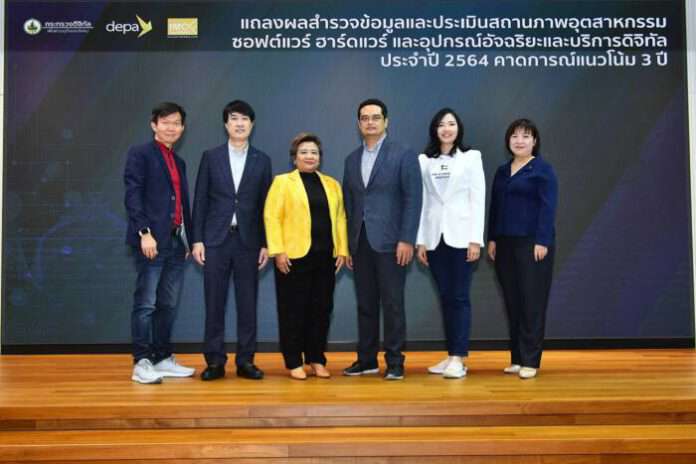 ดร.กษิติธร ภูภราดัย (ที่สามจากซ้าย) รองผู้อำนวยการใหญ่ กลุ่มงานยุทธศาสตร์และความมั่นคง สำนักงานส่งเสริมเศรษฐกิจดิจิทัล หรือ ดีป้า แถลงข่าวแถลงผลสำรวจข้อมูลและประเมินสถานภาพอุตสาหกรรมซอฟต์แวร์ ฮาร์ดแวร์และอุปกรณ์อัจฉริยะ และบริการดิจิทัล ประจำปี 2564 คาดการณ์แนวโน้ม 3 ปี” พร้อมเสวนา “ทิศทางอุตสาหกรรมดิจิทัลไทย ก้าวไปพร้อมกันกับ depa” โดยมี กษมา กองสมัคร (ขวา) ผู้ช่วยผู้อำนวยการใหญ่ กลุ่มงานยุทธศาสตร์และความมั่นคง สำนักงานส่งเสริมเศรษฐกิจดิจิทัล ปฐม อินทโรดม (ที่สองจากซ้าย) กรรมการสภาดิจิทัลเพื่อเศรษฐกิจและสังคมแห่งประเทศไทย กุลธิรัตน์ ภควัชร์ไกรเลิศ (ที่สองจากขวา) นายกสมาคมผู้ประกอบการพาณิชย์อิเล็กทรอนิกส์ไทย วิชัย วรธานีวงศ์ (ซ้าย) และศุภชัย สัจไพบูลย์กิจ (ที่สามจากขวา) ร่วมแถลงข่าว ณ โรงแรม เลอ เมอริเดียน กรุงเทพ เมื่อเร็ว ๆ นี้