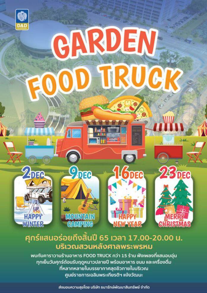 บริษัท ธนารักษ์พัฒนาสินทรัพย์ จำกัด หรือ DAD Asset Development กำหนดจัดงาน “Garden Food Truck” ทุกวันศุกร์ ตลอดเดือนธันวาคม ในวันที่ 2, 9, 16 และ 23 ธันวาคม 2565 ตั้งแต่เวลา 17.00–20.00 น. ณ สวนหลังศาลพระพรหม ศูนย์ราชการเฉลิมพระเกียรติฯ แจ้งวัฒนะ โดยในแต่ละสัปดาห์จะมีรูปแบบงานที่แตกต่างกัน ได้แก่ Happy Winter, Mountain Camping, Merry Christmas และ Happy New Year ภายในงานจะได้พบกับคาราวานอาหาร ขนม และเครื่องดื่ม ในรูปแบบ Food Truck พร้อมรับชมการแสดงดนตรีสดต้อนรับฤดูหนาว