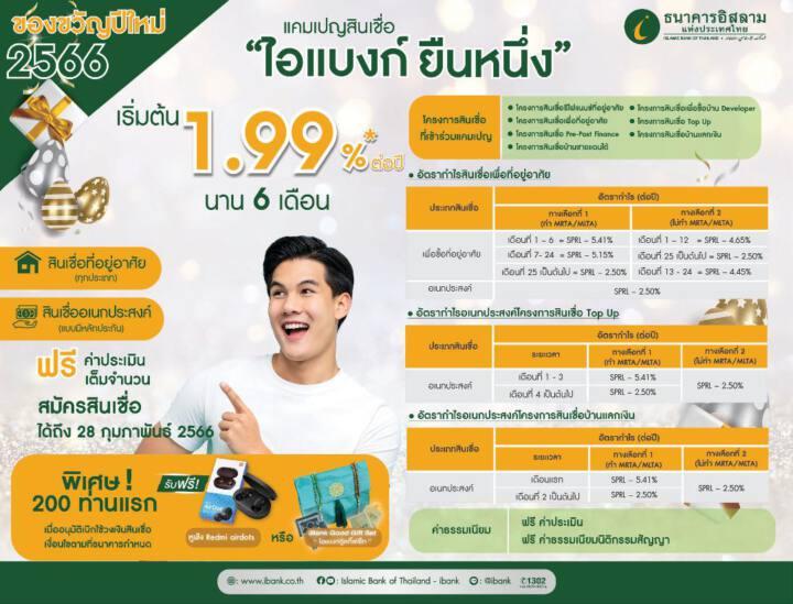 ธนาคารอิสลามแห่งประเทศไทย (ไอแบงก์) จัดแพ็กเกจของขวัญปีใหม่ให้พี่น้องมุสลิมและคนไทยทุกคน ที่ต้องการขอสินเชื่อเพื่อ ซื้อ สร้าง ต่อเติม หรือ รีไฟแนนซ์บ้าน รวมถึงสินเชื่ออเนกประสงค์ คิดอัตรากำไรต่ำพิเศษ เริ่มต้น 1.99% ต่อปี ให้วงเงินสูงสุด 20 ล้านบาท ผ่อนนานสูงสุด 35 ปี พร้อมฟรีค่าประเมินและค่านิติกรรมสัญญา และรับของขวัญที่ระลึกจากธนาคาร