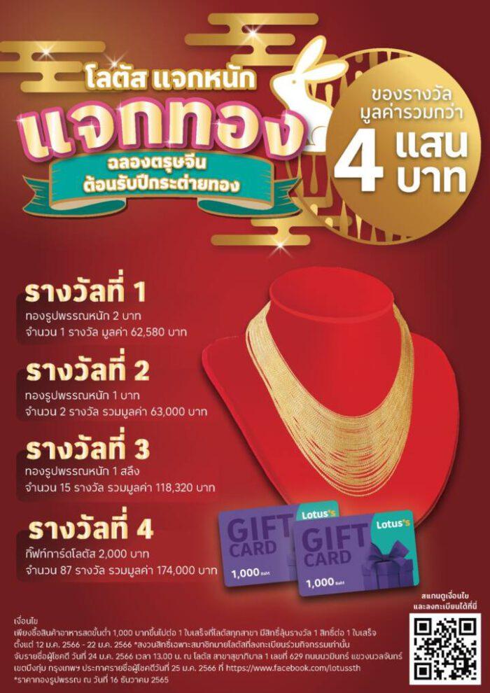 ตรุษจีนนี้ ช้อปสินค้าแบบ เฮง ครบ คุ้ม ที่โลตัสเท่านั้น พร้อมโปรโมชั่นจัดเต็ม• ซื้อแล้วลดเลย อาทิ ชุดไหว้เทพเจ้า, บรรพบุรุษ, เจ้าที่ ราคาโปรโมชั่น เริ่มต้นเพียงชุดละ 94 บาท• ซื้อครบลดอีก เมื่อซื้อสินค้าที่ร่วมรายการครบตามมูลค่าที่กำหนด รับคูปองส่วนลดเพิ่มอีก• ซื้อครบแถมอีก เมื่อซื้อผลิตภัณฑ์ที่ร่วมรายการ รับของแถมมากมาย อาทิ กระเป๋าผ้าร่ำรวยมั่งคั่ง ตะกร้ารับทรัพย์ บัตรของขวัญ• ซื้อครบได้ลุ้นอีก โลตัส แจกทองฉลองตรุษจีน และรางวัลรวมมูลค่ากว่า 400,000 บาท เพียงซื้อสินค้าในแผนกอาหารสดขั้นต่ำ 1,000 บาทต่อใบเสร็จ ภายในวันที่ 12 – 25 มกราคม 2566 เฉพาะลูกค้ามายโลตัสเท่านั้น