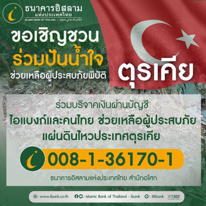 จากเหตุการณ์แผ่นดินไหวทางตะวันออกเฉียงใต้ของตุรเคีย (ตุรกี) ก่อให้เกิดความสูญเสียต่อชีวิตและผู้คนบาดเจ็บเป็นจำนวนมาก เพื่อเป็นการแสดงออกถึงความเป็นน้ำหนึ่งใจเดียวกัน ธนาคารอิสลามแห่งประเทศไทย (ไอแบงก์) ได้เปิดช่องทางให้ประชาชนชาวไทยมีส่วนร่วมในการช่วยเหลือผู้ได้รับผลกระทบจากภัยพิบัติในตุรเคีย และขอเชิญชวนร่วมปันน้ำใจ โดยสามารถบริจาคผ่านบัญชีออมทรัพย์ ธนาคารอิสลามแห่งประเทศไทยเลขที่บัญชี 008-1-36170-1 ชื่อบัญชี “ไอแบงก์และคนไทย ช่วยเหลือผู้ประสบภัยแผ่นดินไหวประเทศตุรเคีย” โดยเงินที่ได้รับบริจาคทั้งหมด ไอแบงก์จะนำไปช่วยเหลือผู้ประสบภัยในประเทศตุรเคียต่อไป สอบถามรายละเอียดเพิ่มเติมได้ที่ โทร. 1302