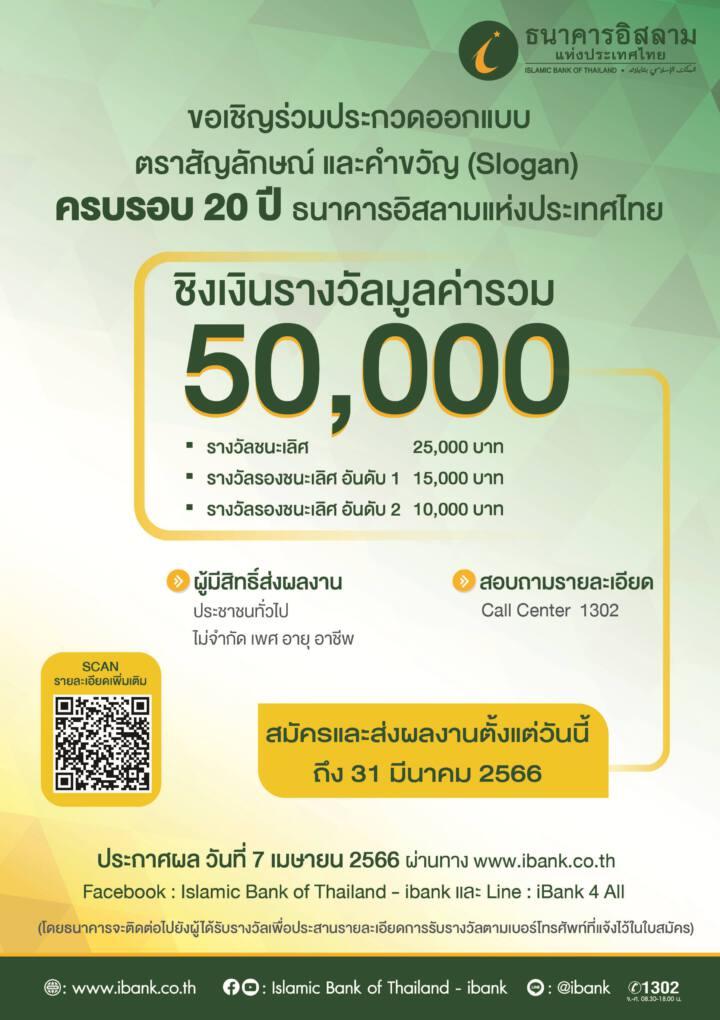 ธนาคารอิสลามแห่งประเทศไทย (ไอแบงก์) เชิญชวนนักออกแบบร่วมประกวดออกแบบตราสัญลักษณ์และคำขวัญ (Slogan) ในโอกาสครบรอบ 20 ปี ชิงเงินรางวัลรวม 50,000 บาท สามารถส่งผลงานเข้าประกวดได้ตั้งแต่วันนี้ จนถึงวันที่ 31 มีนาคม 2566