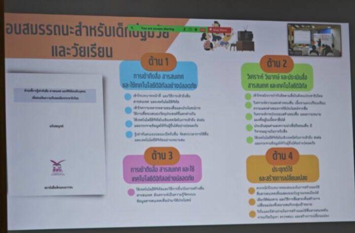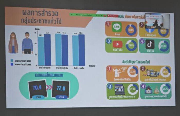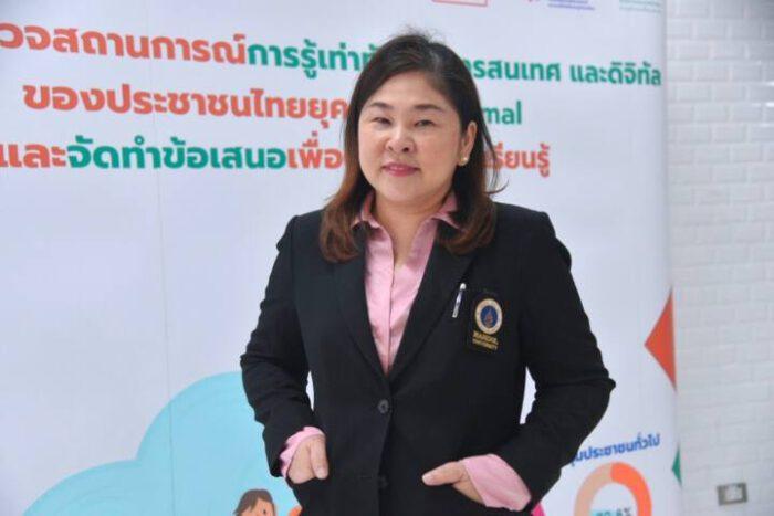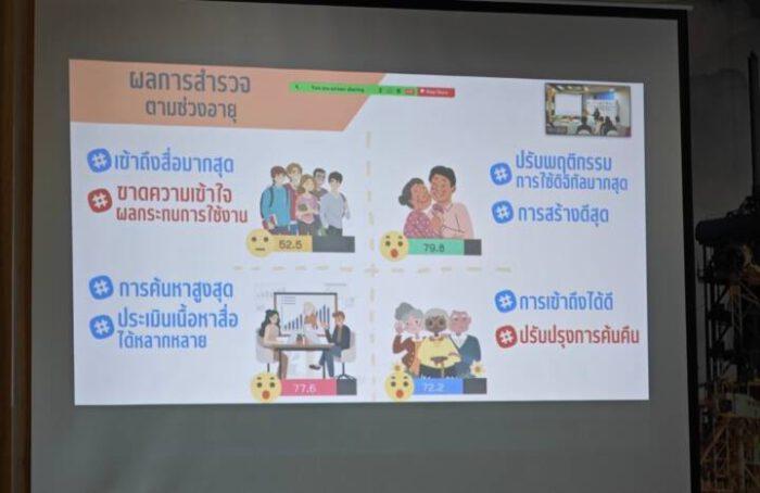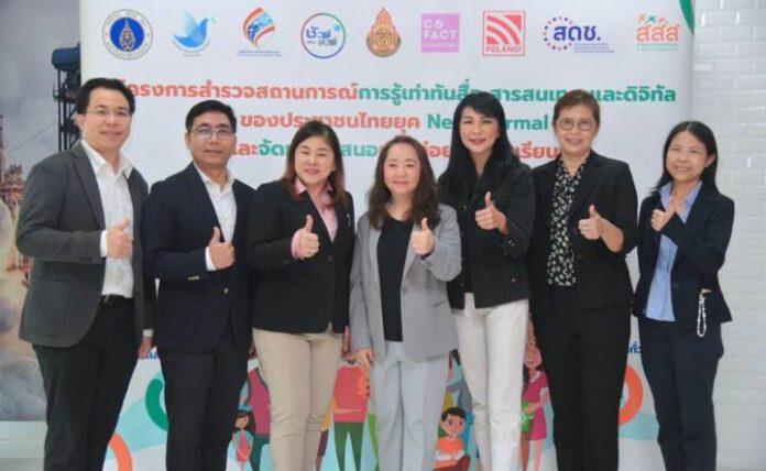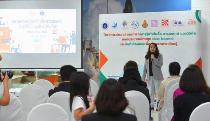 ผศ.ดร.สุภาภรณ์ เกียรติสิน หัวหน้าโครงการสำรวจสถานการณ์รู้เท่าทันสื่อ สารสนเทศ และการเข้าใจดิจิทัลของประชาชนไทยยุค New Normal กล่าวว่า ปัจจุบันเด็กและประชาชนทุกวัยเข้าถึงและใช้สื่อมากขึ้น โดยเฉพาะช่วงโควิด-19 ระบาดการสำรวจครั้งนี้พบว่า กลุ่มเด็กปฐมวัยและเด็กวัยเรียนรู้เท่าทันสื่อในระดับดีมาก ส่วนประชาชนอยู่ในระดับดี แต่เมื่อเจาะลึกกลับพบปัญหาที่ฝังอยู่ คือ เด็กมีภาวะติดจอ อยู่กับโทรศัพท์หรือคอมพิวเตอร์นานกว่า 2 ชั่วโมง, เด็กเสี่ยงถูกหลอกลวงจากผู้ไม่หวังดีทางออนไลน์, ผู้ใหญ่ยังส่งต่อข้อมูลหรือเผยแพร่ข่าวลวง ถูกหลอก ถูกชักจูงใจจากภัยออนไลน์ จึงสานพลังกับ สสส. สร้างความเข้าใจและทำให้ทุกคนตระหนักถึงการรู้เท่าทันสื่อ ปีนี้ต้องการเสนอให้มีหน่วยงานที่มีความรู้ ความเชี่ยวชาญ มาเป็นกำลังหลัก ร่วมผลักดันเรื่องการรู้เท่าทันสื่อสู่ภาคนโยบาย ทั้งทางตรงและทางอ้อม