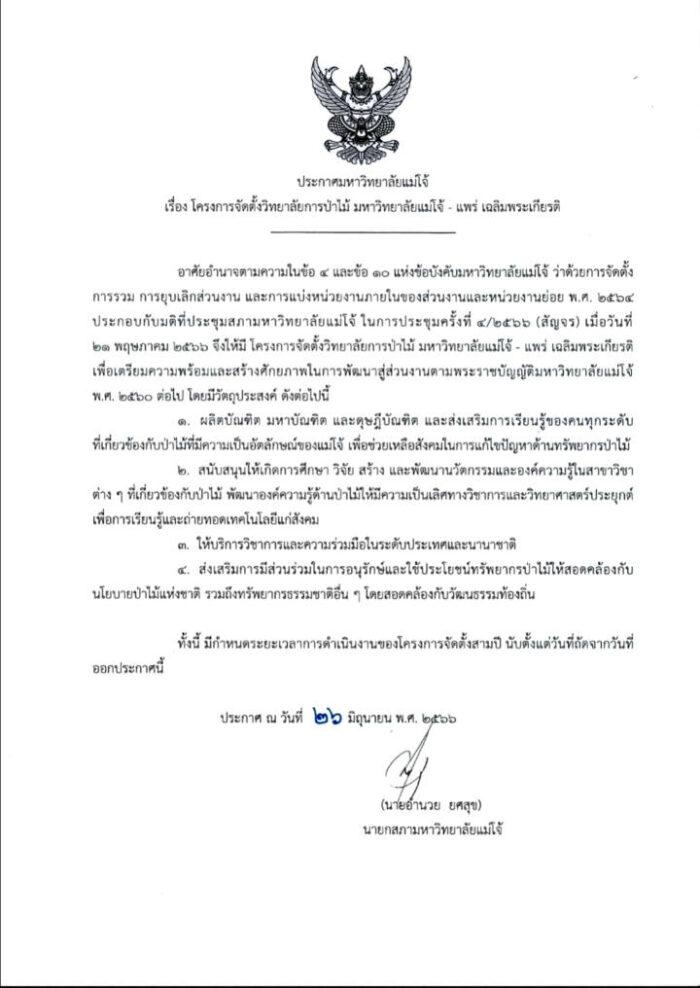 นายอภิชาติ โตดิลกเวชช์ สมาชิกวุฒิสภา และหนึ่งในกรรมาธิการการอุดมศึกษาวิทยาศาสตร์ วิจัยและนวัตกรรมของวุฒิสภา เปิดเผยว่า ภายหลังจากมีพิธีลงนามบันทึกข้อตกลงความร่วมมือ (MOU) ว่าด้วยความร่วมมือจัดตั้งสถาบันนวัตกรรมด้านป่าไม้ จังหวัดแพร่ ภายใต้แนวคิด “เศรษฐกิจภายใต้ผืนป่า Economy Under the Forest” ระหว่าง กรมป่าไม้ ผู้ว่าราชการจังหวัดแพร่ มหาวิทยาลัยราชภัฏอุตรดิตถ์ องค์การบริหารส่วนจังหวัดแพร่ วิทยาลัยชุมชนแพร่ และเทศบาลเมืองแพร่ โดยมีคณะกรรมาธิการ วุฒิสภา ร่วมเป็นสักขีพยาน ณ หอประชุมตรีเทพ โรงเรียนป่าไม้แพร่ ตำบลในเวียง อำเภอเมือง จังหวัดแพร่ เมื่อต้นเดือนที่ผ่านมานั้น ความคืบหน้าล่าสุด ได้มีประกาศมหาวิทยาลัยแม่โจ้ เรื่อง “โครงการจัดตั้งวิทยาลัยการป่าไม้ มหาวิทยาลัยแมโจ้ – แพร่ เฉลิมพระเกียรติ” เมื่อวันที่ 26 มิถุนายน 2566 ลงนามโดย นายอำนวย ยศสุข นายกสภามหาวิทยาลัยแม่โจ้