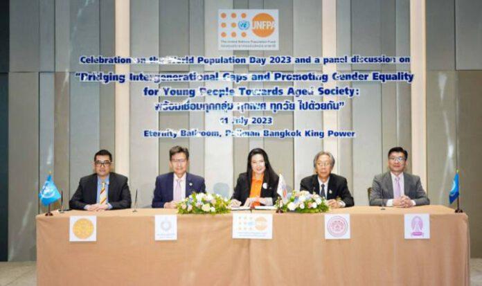 กองทุนประชากรแห่งสหประชาชาติ ประจำประเทศไทย (UNFPA Thailand) จัดงานวันประชากรโลก ประจำปี 2566 (The World Population Day 2023) ร่วมกันแสดงออกและตระหนักในประเด็นปัญหาของประชากรโลก ส่งเสริมสนับสนุนให้ความรู้สิทธิพื้นฐาน การวางแผนครอบครัว เพื่อนำไปสู่การมีประชากรโลกที่มีคุณภาพชีวิตที่ดี พร้อมจัดลงนาม MOU ร่วมกับ 4 หน่วยงานสำคัญ จัดเวทีเสวนา “Bridging Intergenerational Gaps and Promoting Gender Equality for Young People Towards Aged Society: พร้อมเชื่อมทุกกลุ่ม ทุกเพศ ทุกวัย ไปด้วยกัน” พร้อมด้วยการมอบรางวัล Social Media Contest โดยมีผู้แทนหน่วนงานองค์กรภาครัฐ ภาคประชาสังคม ภาคเอกชน นิสิตนักศึกษา สื่อมวลชน และผู้สนใจ ร่วมงานอย่างคับคั่ง