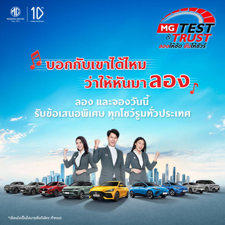 นายพงษ์ศักดิ์ เลิศฤดีวัฒนวงศ์ รองกรรมการผู้จัดการ บริษัท เอ็มจี เซลส์ (ประเทศไทย) จำกัด กล่าวว่า “จากแนวทางการดำเนินงานในโอกาสครบรอบ 10 ปี พร้อมก้าวสู่ทศวรรษต่อไปภายใต้นโยบาย Customer Centric เอ็มจีไม่ได้หยุดเพียงแค่การนำเสนอยนตรกรรมที่เพียบพร้อมไปด้วยสมรรถนะ ดีไซน์ นวัตกรรม และความปลอดภัยเท่านั้น แต่ยังให้ความสำคัญกับความหลากหลายและครบครันของยนตรกรรมให้ครอบคลุมในทุกรูปแบบการขับเคลื่อน เพื่อตอบโจทย์ทุกไลฟ์สไตล์และรูปแบบการใช้งานของคนไทย พร้อมส่งมอบความพึงพอใจสูงสุดให้กับลูกค้า ล่าสุด เอ็มจี ได้เดินหน้าแผนงานเพื่อขยายการรับรู้แบรนด์ ผลิตภัณฑ์ และการบริการสู่เป้าหมายในวงกว้างมากยิ่งขึ้น และมุ่งเน้นการมีปฏิสัมพันธ์ระหว่าง เอ็มจี และผู้บริโภค ด้วยการเปิดตัวแคมเปญ ‘MG TEST & TRUST ลองให้ชัด ขับให้ชัวร์’ เพื่อให้ลูกค้าที่สนใจรถยนต์ เอ็มจี ได้มาทดสอบโมเดลรุ่นใหม่ๆ ที่สามารถรองรับไลฟ์สไตล์ที่เปลี่ยนไป พร้อมประสบการณ์การขับขี่ครั้งใหม่ที่ดียิ่งขึ้น ผู้ที่สนใจสามารถร่วมกิจกรรมกับ เอ็มจี ได้วันนี้ที่โชว์รูมและศูนย์บริการคุณภาพ ทั้ง 160 แห่งทั่วประเทศ