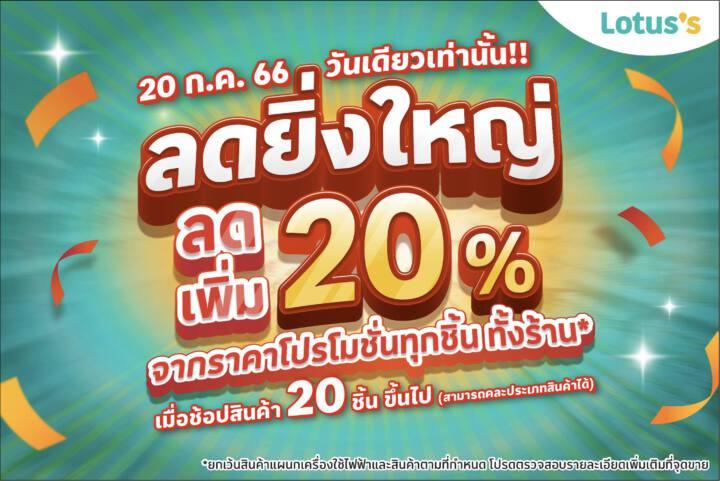 ลดช็อกโลก! โลตัส จัดโปรสุดอลังการวันเดียวเท่านั้น ลดเพิ่ม 20% ยกทั้งห้าง เมื่อซื้อสินค้า 20 ชิ้นขึ้นไป 20 ก.ค. ที่โลตัสสาขาใหญ่และซูเปอร์มาร์เก็ตทั่วประเทศ