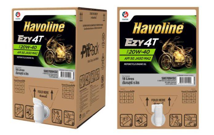 “บริษัทฯ นำร่องเปิดตัว PitPack™ ขนาดบรรจุ 18 ลิตร สำหรับน้ำมันเครื่องคาลเท็กซ์ ฮาโวลีน อีซี่ 4ที SAE 20W-40 (Caltex Havoline Ezy 4T SAE 20W-40) ซึ่งเป็นน้ำมันเครื่องสำหรับรถจักรยานยนต์ 4 จังหวะให้การปกป้องทั้งเครื่องยนต์ เกียร์ และคลัทช์ ช่วยให้การขับขี่ราบรื่น บิดได้แรงเต็มกำลัง มาตรฐาน API SG JASO MA2 โดยลดการใช้พลาสติกในการผลิตบรรจุภัณฑ์นี้ได้ 90% เมื่อเปรียบเทียบกับพลาสติกที่ใช้สำหรับบรรจุผลิตภัณฑ์ในรูปแบบขวดใช้ครั้งเดียวทิ้งขนาด 0.8 หรือ 1 ลิตร (เทียบเท่าปริมาณ 18 ลิตร) ทั้งนี้ บรรจุภัณฑ์ใหม่ PitPack™ มาพร้อมกับถาดรองกันน้ำมันหยด และเหยือกตวงน้ำมัน ทำให้ช่างสามารถใช้งานได้อย่างง่ายดาย ไม่หกเลอะเทอะและสิ้นเปลือง เพิ่มความเป็นระเบียบและความสะดวกในการใช้งานสะท้อนความเป็นมืออาชีพของอู่ซ่อมรถจักรยานยนต์”