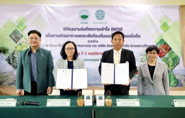 สถาบันวิจัยและพัฒนาพื้นที่สูง (องค์การมหาชน) หรือ สวพส. นำโดย นายวิรัตน์ ปราบทุกข์ ผู้อำนวยการสถาบันวิจัยและพัฒนาพื้นที่สูง และ นางสาวนฤมล ทักษอุดม กรรมการผู้จัดการ บริษัท ฮิลล์คอฟฟ์ จำกัด (กาแฟชาวไทยภูเขา) ได้ลงนามบันทึกความเข้าใจ (Memorandum Of Understanding :MOU) เพื่อการพัฒนากาแฟและพืชท้องถิ่นบนพื้นที่สูงแบบยั่งยืน โดยมีวัตถุประสงค์เพื่อร่วมมือในการยกระดับการผลิต การตลาด การเพิ่มมูลค่า และการสร้างคุณค่าของกาแฟและพืชท้องถิ่น ด้วยองค์ความรู้และนวัตกรรมทางการเกษตรภายใต้ระบบการผลิตที่เป็นมิตรกับสิ่งแวดล้อม มู่งสู่ความเป็นกลางทางคาร์บอน (Carbon neutral) และการดูแลทรัพยากรบนพื้นที่สูงอย่างยั่งยืน ตลอดจนการส่งเสริมการรับรองพืชจากแหล่งปลูก ผลิตภัณฑ์ชุมชน และผู้ประกอบการ และภายใต้ความเป็นมิตรต่อสิ่งแวดล้อม (Forest stamp – ไม่เผา ไม่บุกรุกป่า สร้างระบบวนเกษตร ผลิตภัณฑ์ของคนดี)