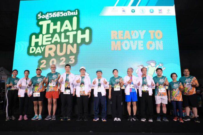 วันที่ 5 พ.ย.2566 ที่บริเวณใต้สะพานพระราม 8 และสวนหลวงพระราม 8 กรุงเทพฯ นพ.สุรเชษฐ์ สถิตนิรามัย รองประธานกรรมการกองทุนสนับสนุนการสร้างเสริมสุขภาพ (สสส.) คนที่ 2 กล่าวว่า สสส. สานพลัง สมาพันธ์ชมรมเดิน-วิ่งเพื่อสุขภาพไทย และสมาคมการค้าผู้จัดงานกีฬามวลชนไทย (TMPSA) และภาคีเครือข่าย จัดกิจกรรมเดิน-วิ่ง Thai Health Day Run 2023 วิ่งสู่วิถีชีวิตใหม่ ครั้งที่ 11 ภายใต้แนวคิด Ready to Move On ก้าวสู่การมีสุขภาพดีไปพร้อมกัน เน้นมาตรฐานความปลอดภัยทางการแพทย์ พร้อมพัฒนานวัตกรรมส่งเสริมให้นักวิ่งมีความรู้ ความเข้าใจ เกี่ยวกับการเตรียมความพร้อมของร่างกายก่อนวิ่ง นำไปสู่การยกระดับการจัดงานวิ่งที่ได้มาตรฐานความปลอดภัย มุ่งเป้าสร้างสังคมกระฉับกระเฉง ส่งเสริมให้เกิดนักวิ่งหน้าใหม่เพิ่มขึ้น