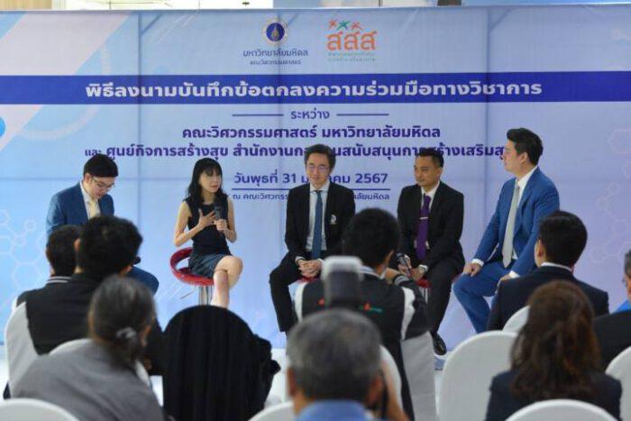 รศ.ดร.ธนภัทร์ วานิชานนท์ คณบดีคณะวิศวกรรมศาสตร์ มหาวิทยาลัยมหิดล กล่าวว่า คณะวิศวกรรมศาสตร์ มุ่งสร้างธุรกิจเอสเอ็มอีและเพิ่มพื้นที่สร้างเสริมสุขภาพ ให้เศรษฐกิจไทยเดินหน้าต่อ ที่ผ่านมา ได้พัฒนานวัตกรรม UVC Moving CoBot ระบบหุ่นยนต์ฆ่าเชื้อด้วยรังสียูวีซีแบบเคลื่อนที่ สามารถฆ่าเชื้อไวรัสและแบคทีเรียได้ถึง 99.99% ควบคุมระยะห่าง กำหนดความเร็วแม่นยำ ทำงานอัตโนมัติแทนมนุษย์ได้ 24 ชม. เช่น เครื่องอบฆ่าเชื้อใบปริญญาบัตร โดยเฉพาะในช่วงการแพร่ระบาดของโควิด-19 หุ่นยนต์ได้ช่วยปฏิบัติงานทางการแพทย์ใน รพ.สนาม นำไปสู่ความมั่นคงทางสุขภาพ การสร้างความร่วมมือกับ สสส. ครั้งนี้ เป็นจุดเริ่มต้นของการบ่มเพาะนวัตกรสุขภาพ ปัจจัยสำคัญในการขับเคลื่อนไทยเข้าสู่ยุคดิจิทัลอย่างเต็มรูปแบบ รวมถึงสร้างนวัตกรรมสุขภาพที่มีคุณภาพ ใช้งานได้จริง เป็นประโยชน์กับประชาชนให้ใช้งานในชีวิตประจำวันอย่างมีประสิทธิภาพ