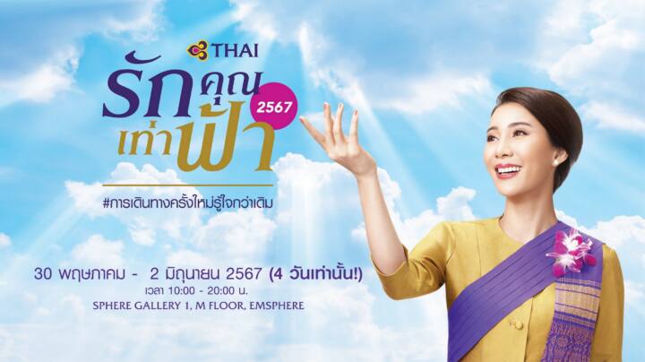 บริษัท การบินไทย จำกัด (มหาชน) เตรียมจัดงาน “รักคุณเท่าฟ้า 2567” พร้อมชวนทุกคนวางแผนการเดินทางกันอีกครั้งผ่านแคมเปญ “การเดินทางครั้งใหม่ รู้ใจกว่าเดิม” ในวันพฤหัสบดีที่ 30 พฤษภาคม – วันอาทิตย์ที่ 2 มิถุนายน 2567 นี้ ตั้งแต่เวลา 10:00 – 20:00 น. ณ สเฟียร์แกลเลอรี่ 1, ชั้น M, ศูนย์การค้าเอ็มสเฟียร์