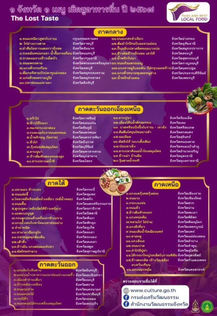 วธ.ประกาศผลการคัดเลือก “1 จังหวัด 1 เมนู เชิดชูอาหารถิ่น รสชาติ…ที่หายไป The Lost Taste” ประจำปี 2567 ประชาชนร่วมโหวตเมนูในทุกจังหวัด 1.99 แสนคน