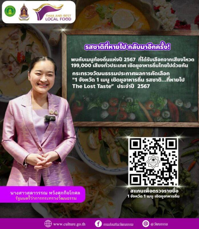 รมว.วธ กล่าวว่า บัดนี้ สวธ. ได้ผลการคัดเลือก 1 จังหวัด 1 เมนู เชิดชูอาหารถิ่น “รสชาติ…ที่หายไป The Lost Taste” ประจำปี 2567 แล้ว โดยมีเมนูอาหารที่ให้ประชาชนร่วมโหวตทั่วประเทศ 563 รายการ แบ่งเป็นเมนูอาหารคาว 234 รายการ เมนูอาหารหวาน 184 รายการ เมนูอาหารว่าง 143 รายการ และเมนูอาหารอื่น 2 รายการ ทั้งนี้ ประชาชนได้มีส่วนร่วมในการโหวตคัดเลือกผ่านสื่อท้องถิ่น สื่อออนไลน์ต่าง ๆ ทุกช่องทาง ซึ่งแต่ละเมนูมีความพิเศษและสะท้อนถึงวัฒนธรรมและวิถีชีวิตของแต่ละจังหวัดอย่างชัดเจน เช่น เมนูอาหารหวานจากจังหวัดปราจีนบุรี “ขนมหน่อไม้” ได้รับความสนใจและมีการโหวตสูงสุดถึง 22,945 คะแนน รองลงมาได้แก่ เมนูอาหารหวาน “ขนมถังแตกมอญ” จากจังหวัดกาญจนบุรี 4,660 คะแนน และ เมนูอาหารคาว “ปลายอก ข้าวบอก” จากจังหวัดกระบี่ 4,259 คะแนน นอกจากนี้ยังมีเมนูที่น่าสนใจอีกมากมาย อาทิ “ขนมเหนียวสูตรโบราณ” จากกทม. , “กาละแมรวงข้าวเม็ดบัว” จากจังหวัดปทุมธานี “ยำไก่ผีปู่ย่า” จากจังหวัดสุโขทัย, “แกงอีเหี่ยว”จากจังหวัดเพชรบูรณ์ และ “แกงคั่วหนามพุงดอหมูย่าง” จากจังหวัดประจวบคีรีขันธ์ ,“ข้าวมัน แกงตอแมะห์ปลา” จากจังหวัดสตูล “น้ำพริกหมู (โคราช)” จากจังหวัดนครราชสีมา, “นมเนียล” จากจังหวัดสุรินทร์ เป็นต้น