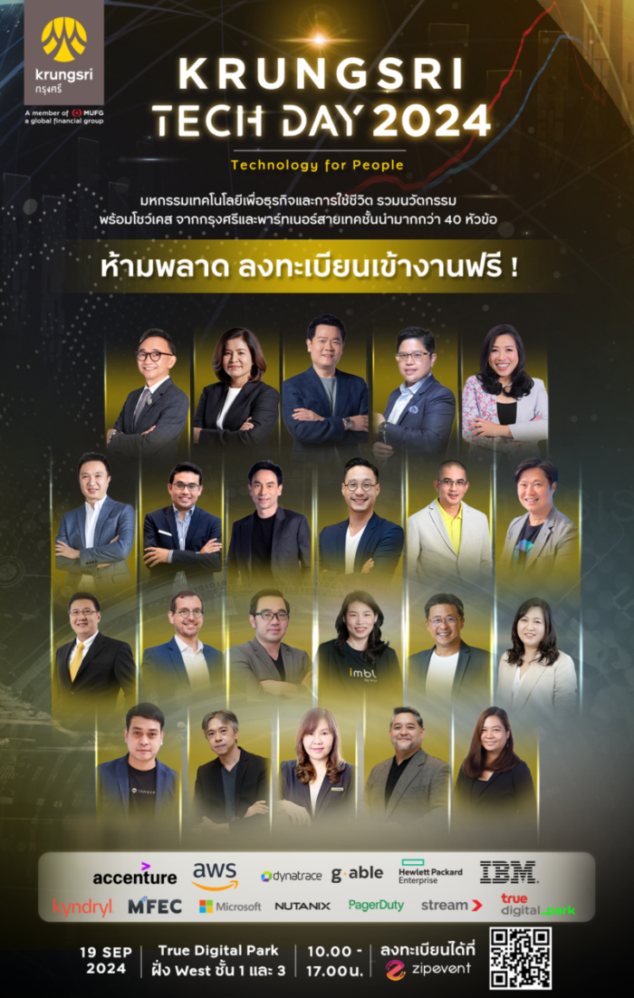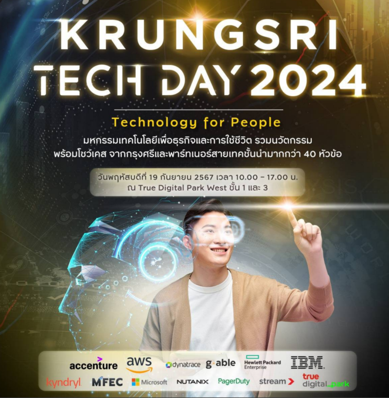 โดยงานนี้กรุงศรีร่วมมือกับพาร์ทเนอร์นำเสนอความก้าวหน้าและการใช้งานเทคโนโลยีที่ช่วยให้ทั้งชีวิตและการทำธุรกิจง่ายขึ้นในทุกมิติ ได้แก่ Accenture, AWS, Dynatrace, G-Able, HPE, IBM, Kyndryl, MFEC, Microsoft, NUTANIX, PagerDuty, Stream และ True Digital Park
