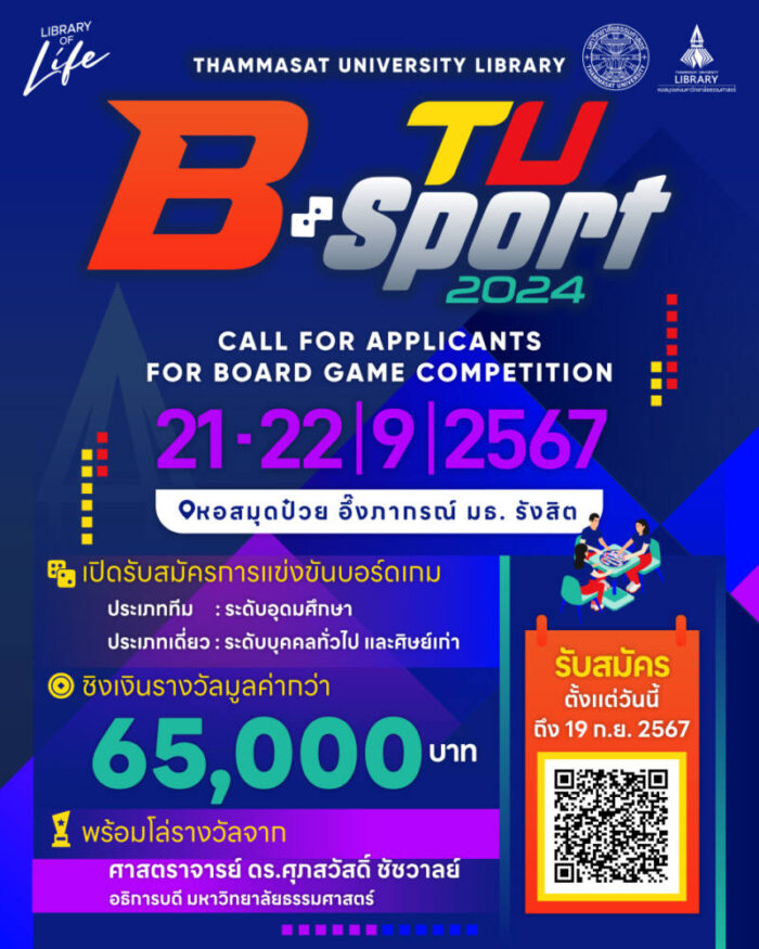 มหาวิทยาลัยธรรมศาสตร์ โดยหอสมุดแห่งมหาวิทยาลัยธรรมศาสตร์ ร่วมกับ ชุมนุมบอร์ดเกม จัดการแข่งขันบอร์ดเกมครั้งใหญ่ TU B-Sport 2024 ระหว่างวันที่ 21-22 ก.ย.67 นี้ เชิญชวนนักศึกษา/ประชาชนจากทั่วประเทศร่วมชิงเงินรางวัลรวมมูลค่ากว่า 65,000 บาท พร้อมเปิด “หอสมุดป๋วย อึ๊งภากรณ์ มธ. ศูนย์รังสิต” เป็นสนามแข่ง หวังกระตุ้นการเรียนรู้และความคิดสร้างสรรค์ไร้ขีดจำกัด ยกระดับสู่ “Library of Life” เต็มสูบ
