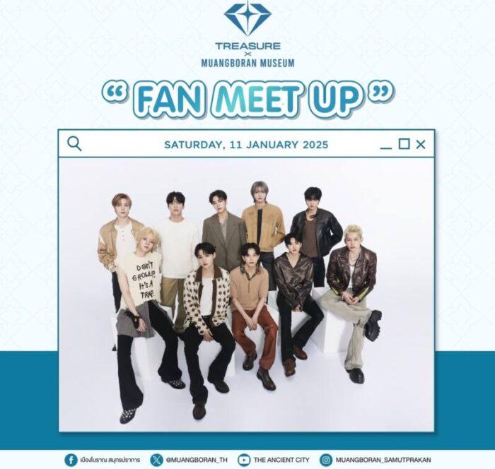 ไม่ทำให้ผิดหวัง หลังจากเมืองโบราณ พิพิธภัณฑ์เอกชนกลางแจ้งที่ใหญ่ที่สุดในโลกของมวลมนุษยชาติ ประกาศเปิดตัวแอมบาสเดอร์คือวง TREASURE ศิลปินเคป๊อปจากประเทศเกาหลีใต้ภายใต้สังกัดค่าย YG Entertainment ก็ประกาศกิจกรรมสุดพิเศษ TREASURE X MUANGBORAN จัดขึ้นในวันที่ 11 มกราคม 2568 ณ เมืองโบราณสมุทรปราการ อย่างต่อเนื่องเพื่อให้แฟนๆได้ลุ้นสิทธิ์เข้าร่วม Fan Meet Up กับ TREASURE และหวังให้ทุกคนได้รู้จักเมืองโบราณในมิติใหม่ที่สนุกกว่าเดิม